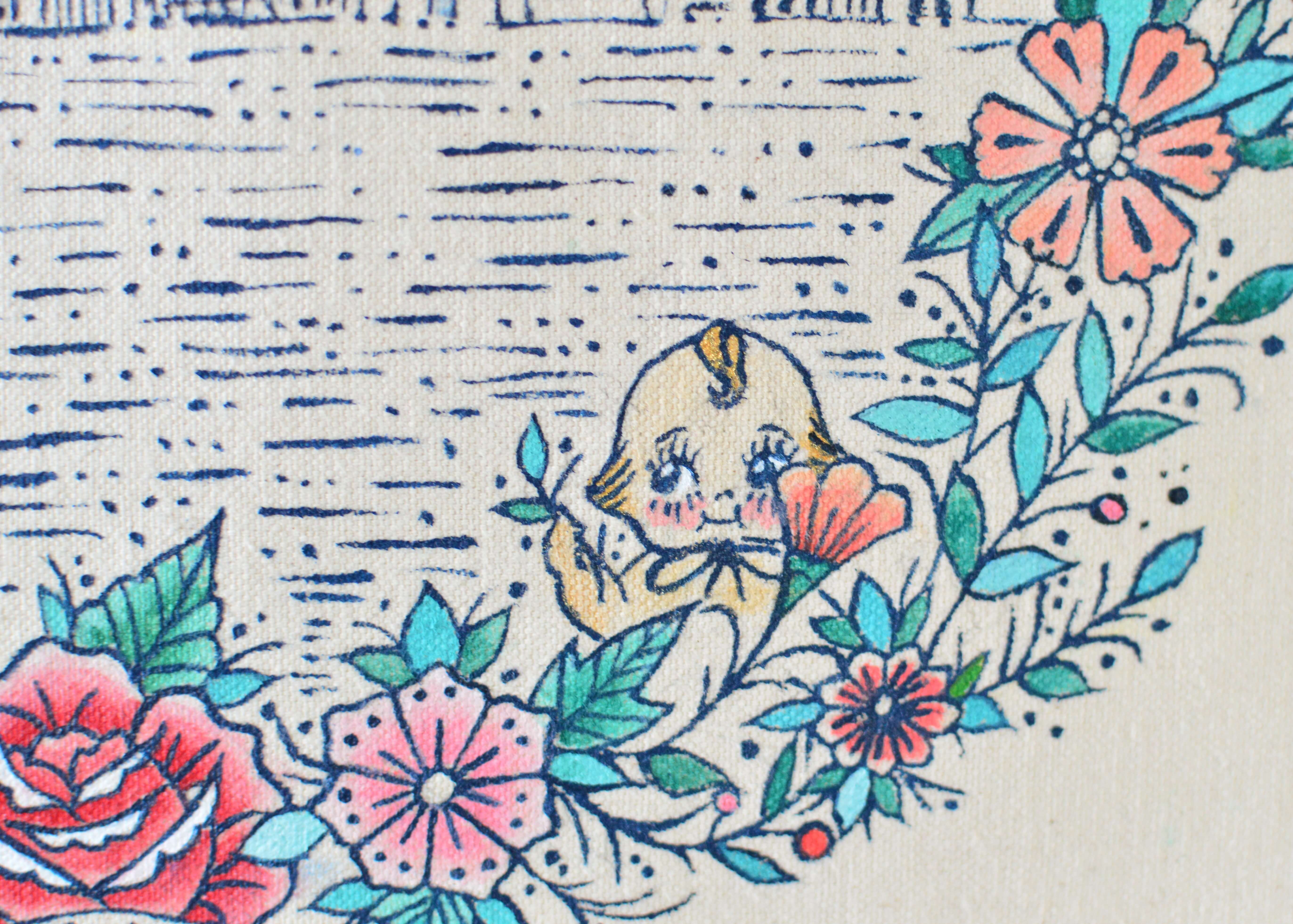 タペストリーのリース部分の配色はポールさんが居酒屋店主から貰った高島屋のバッグからインスピレーションを受け、旅先で出会ったキューピー人形やコーギーちゃん、シャチホコや焼き鳥屋で食べさせられたジャコウネコ氏(!)などをこっそり配置してます。