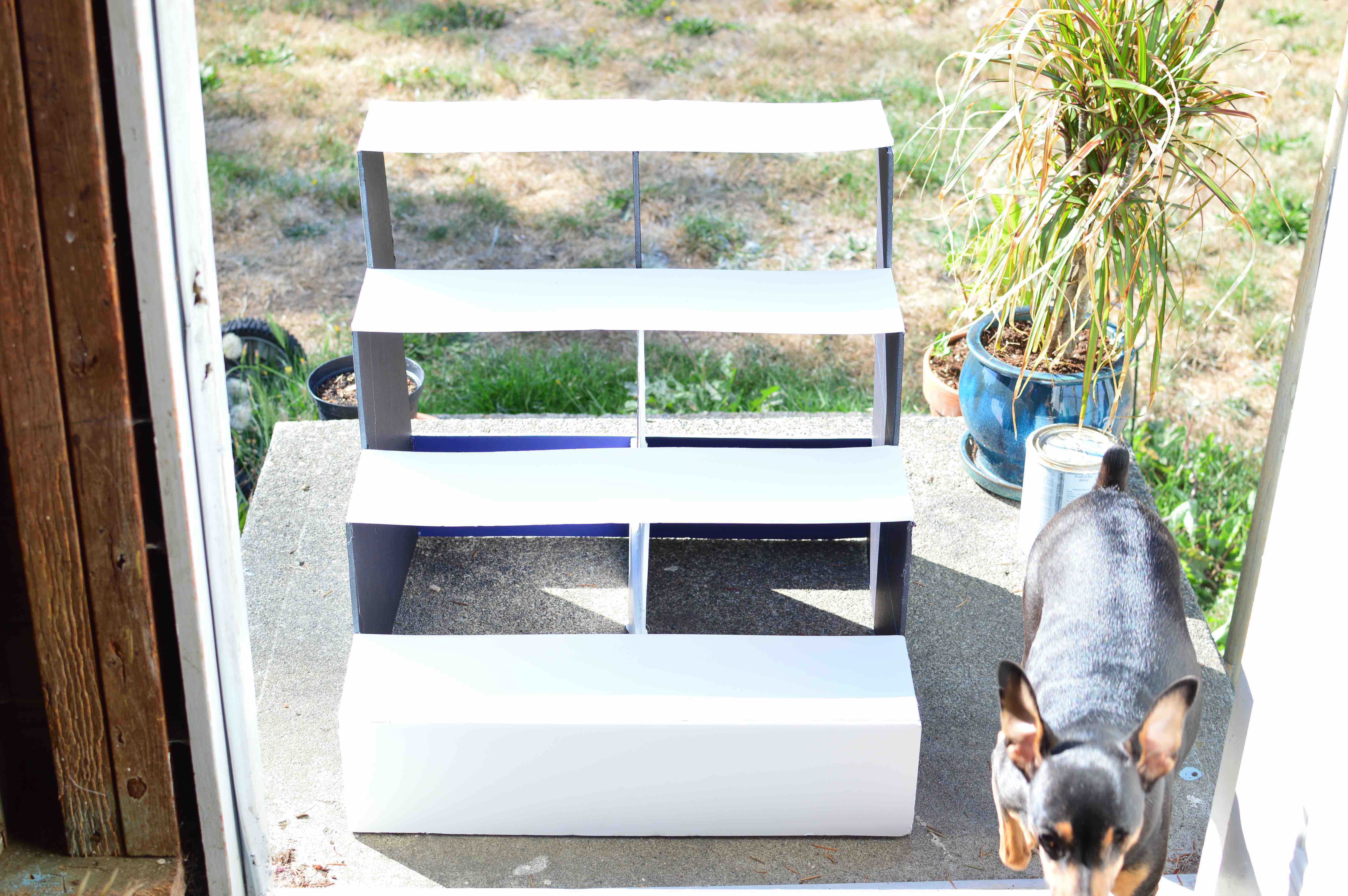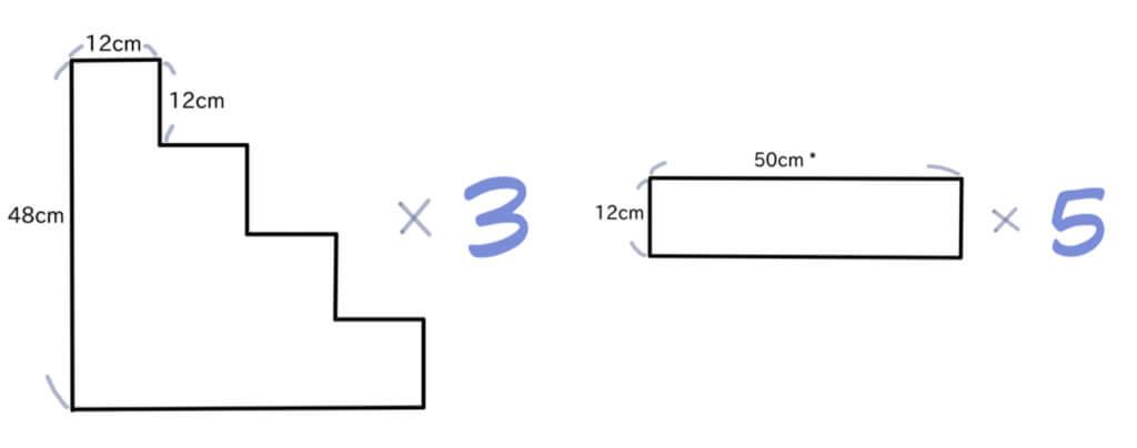 私は1段の高さと奥行きを同じサイズにして(各12cm/5インチ)、横幅は切らなくても良いようにボードの横幅(50cm)をそのまま活用しました。