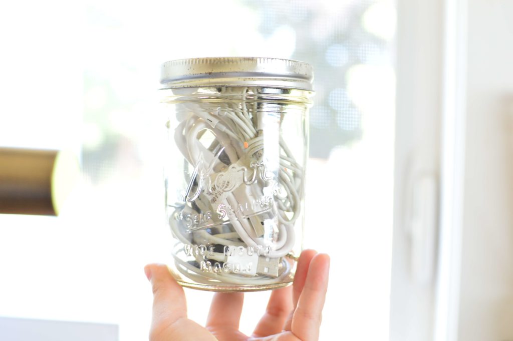 USB-C/ライトニングケーブル/イヤホン/一丸レフ用のUSB/GoPro用のUSBなどゴチャゴチャするコード類をまとめてジャーにIN。