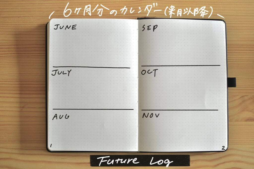 見開き2ページを六分割し、各欄に次の6ヶ月を割り当てます。各月の大きな予定(締め切り、誕生日など)やタスクなどをメモします。