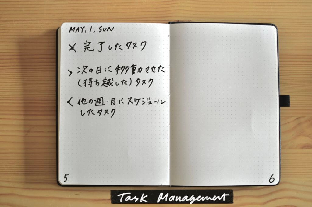 タスクの進捗をチェックし、未完のアイテムを適切なページに移動させる。例えば今日書いた未完タスクが