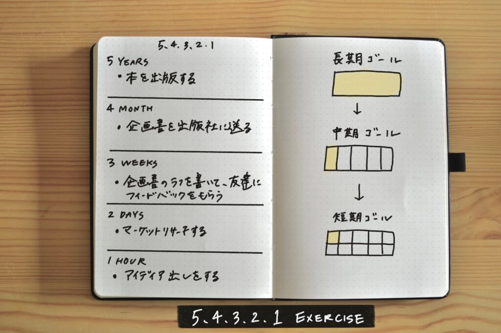 例えば、5年後の目標が「書籍を出版している」だった場合はこんな感じです。