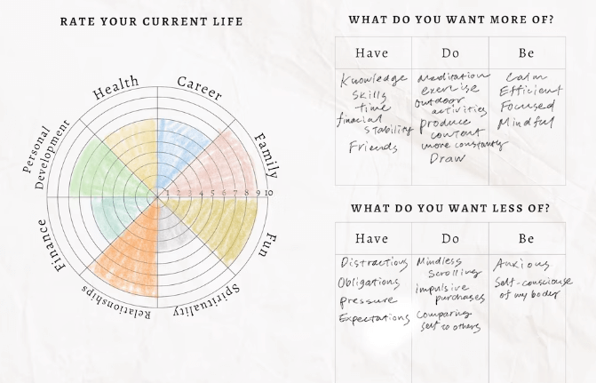 まずは現状を把握するために、人生の満足度をエリア別に(キャリア・健康・自己成長・お金・関係・趣味・家族)1〜10のスケールで評価をつけます。次に、欲しいこと/手放したいこと、をそれぞれ HAVE・ DO・ BE(持ってるモノ、しているコト、自分の在り方)の観点に分けて書き出します。
