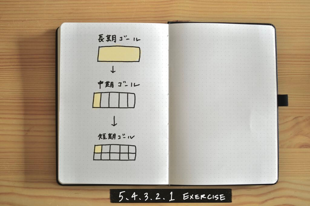 *本家 The Bullet Journal Method ではこのエクササイズが「ゴールを期間別に振り分ける方法」として紹介されていますが、私は「長期目標(夢)を叶えるための中期・短期ゴールを逆算する方法」として活用しています。