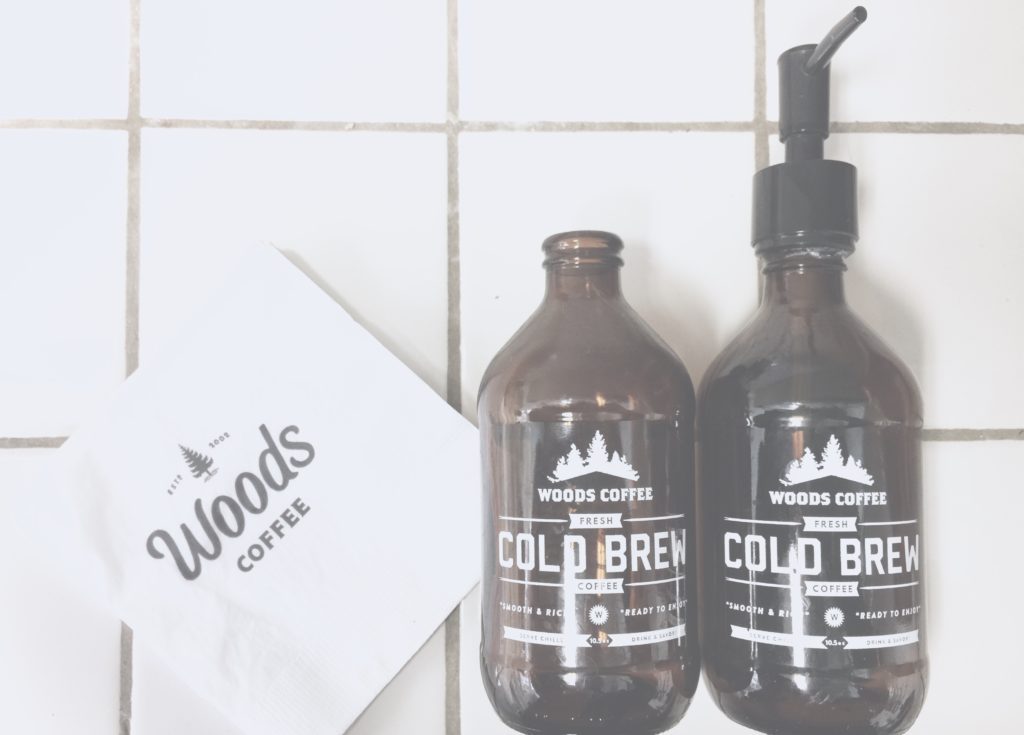 ローカルフード繋がりなのですが、この牛乳瓶の隣にある茶色い瓶はWoods Coffeeというコーヒー屋さんのもの。