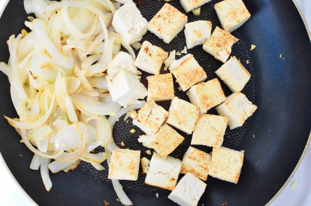 火が通って来たら玉ねぎを端に寄せて豆腐を両面カリッと焼き付ける。