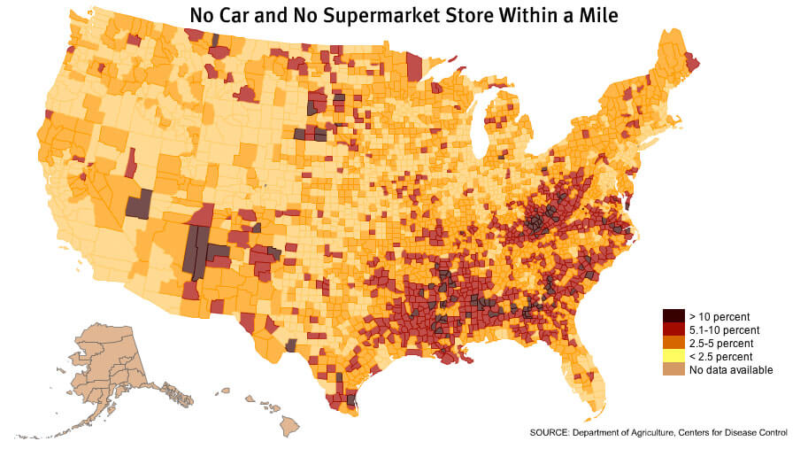 USDA(United States Department of Agriculture=米国農務省) によると、現在アメリカでは約2300万人が生鮮食品店から10マイル(約16km)も離れた所で生活しているそう。