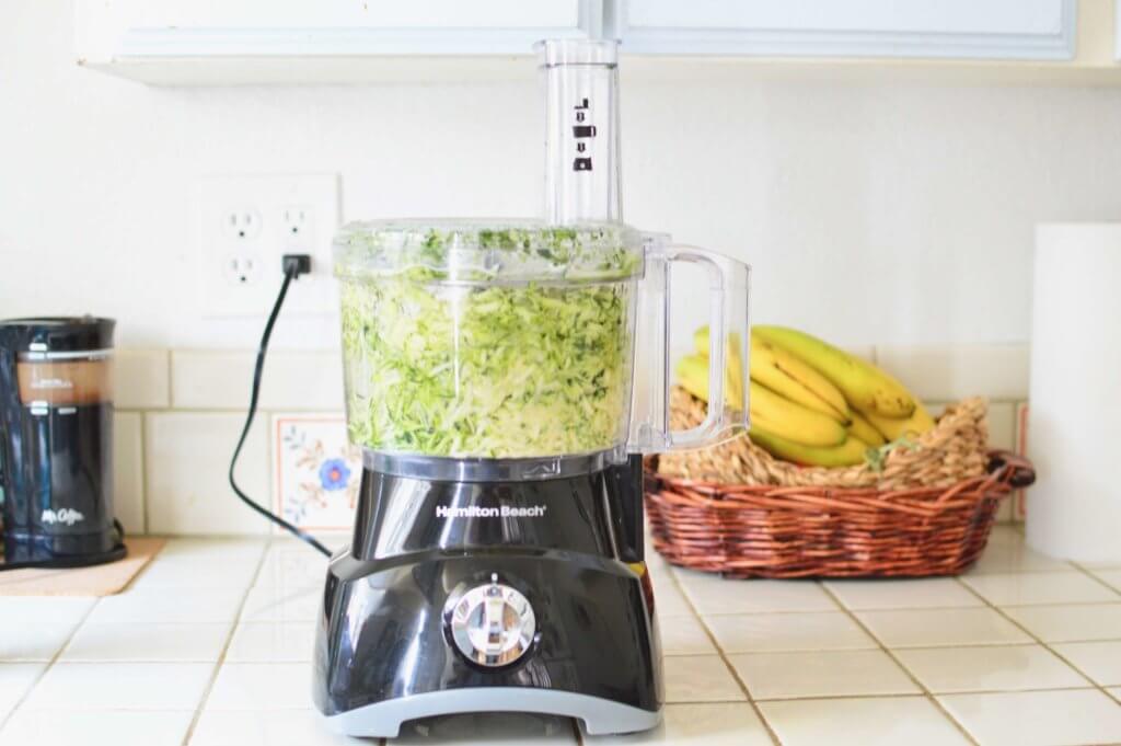 1. まずズッキーニをフードプロセッサーで千切りにして、塩を大さじ1(分量外)ふりかけ15分程放置。